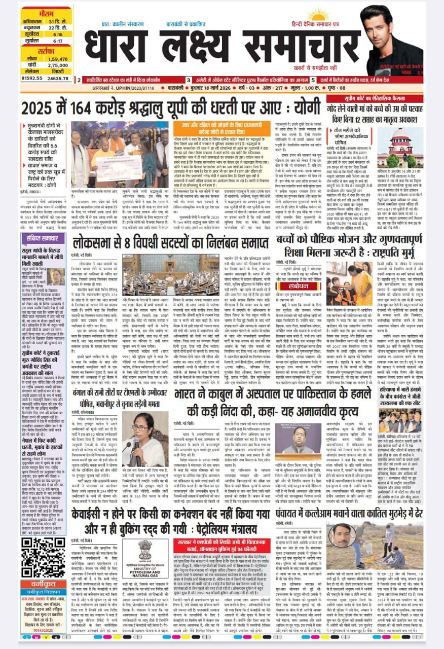 ई पेपर पढ़ें प्रातः कालीन संस्करण बाराबंकी से प्रकाशित हिंदी दैनिक धारा लक्ष्य समाचार पत्र 19 मार्च 2026