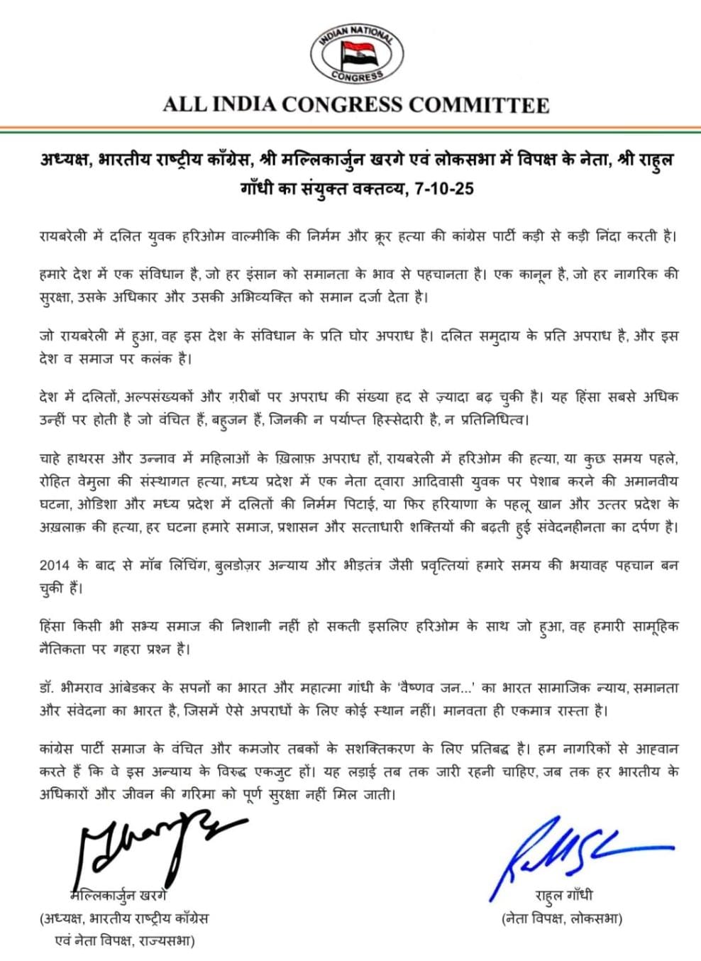 जिला रिपोर्टर रोहित मिश्रा रायबरेली रायबरेली में कांग्रेस नेता राहुल गांधी और पार्टी अध्यक्ष मल्लिकार्जुन खड़गे ने रायबरेली में हरिओम पासवान की पीट-पीटकर हुई हत्या की कड़ी निंदा करते हुए एक संयुक्त बयान जारी किया है।राहुल गांधी ने ‘एक्स’ पर इसे “इंसानियत, संविधान और न्याय की हत्या” बताया। उन्होंने कहा कि आज भारत में दलितों, आदिवासियों, मुसलमानों, पिछड़ों और गरीबों को निशाना बनाया जा रहा है, जिनकी आवाज कमजोर है। उन्होंने आरोप लगाया कि देश में नफरत, हिंसा और भीड़तंत्र को सत्ता का संरक्षण मिला हुआ है, जहां संविधान की…
