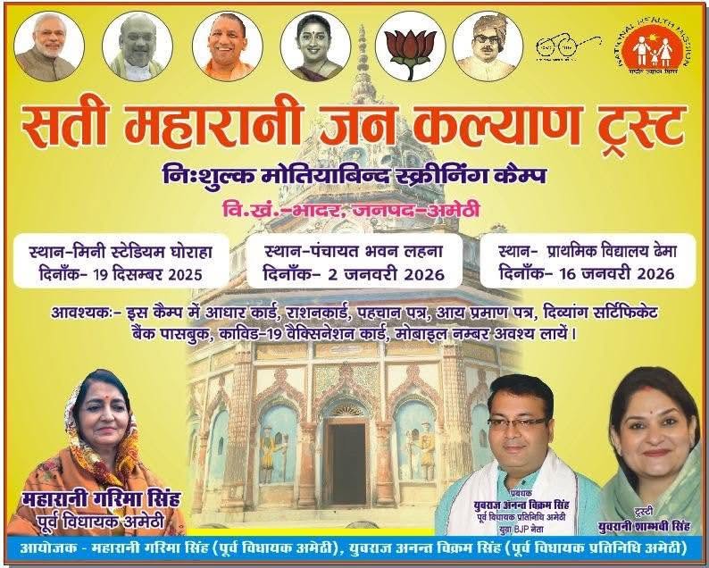 धारा लक्ष्य समाचार पत्र अमेठी। जनसेवा और सामाजिक उत्तरदायित्व की भावना को साकार करते हुए सती महारानी जन कल्याण ट्रस्ट एवं अमेठी आई हॉस्पिटल के संयुक्त तत्वावधान में एक विशाल निःशुल्क नेत्र जाँच शिविर का आयोजन किया जा रहा है। यह शिविर 19 दिसंबर 2025 दिन शुक्रवार को प्रातः 11:00 बजे से मिनी स्टेडियम, घोरहा, भादर में आयोजित होगा। इस जनकल्याणकारी शिविर की आयोजक एवं मुख्य अतिथि रानी शाम्भवी सिंह तथा विशिष्ट अतिथि राजकुमार अनंत विक्रम सिंह होंगे। उनके नेतृत्व और मार्गदर्शन में आयोजित यह शिविर क्षेत्र के ग्रामीण एवं…
