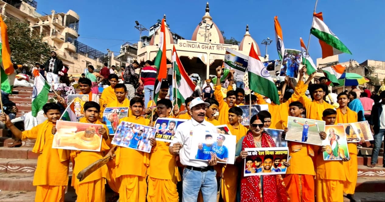 “लभगवान शिव से भारत की जीत का मांगा आशीर्वाद। भारत की पाकिस्तान पर जीत के लिए उतारी मां गंगा की आरती, बाबा विश्वनाथ से की प्रार्थना। वाराणसी महाशिवरात्रि के पावन अवसर पर काशी के पौराणिक सिंधिया घाट पर टी – 20 विश्व कप क्रिकेट में पाकिस्तान टीम पर भारतीय टीम की जीत के लिए नमामि गंगे और महर्षि योगी वेद विज्ञान विद्यापीठ के वेदपाठी बटुकों ने वेदमंत्रों के साथ आरती उतार बाबा विश्वनाथ और मां गंगा से आशीर्वाद मांगा। वहीं, बाबा विश्वनाथ, प्रभु श्री रामलला, भारत माता और भारतीय क्रिकेटरों…
