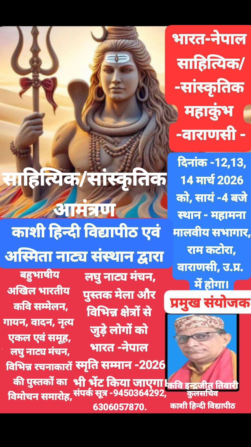 काशी में 12–14 मार्च को भारत–नेपाल साहित्यिक/सांस्कृतिक महाकुंभ। काशी विश्वनाथ धाम की पावन नगरी वाराणसी में पशुपतिनाथ मंदिर के नाम समर्पित तीन दिवसीय भारत–नेपाल साहित्यिक/सांस्कृतिक महाकुंभ का आयोजन 12, 13 और 14 मार्च 2026 को प्रतिदिन सायं 4 बजे से महामना मालवीय सभागार, काशी सेवा समिति, रामकटोरा में किया जाएगा। कार्यक्रम का आयोजन काशी हिन्दी विद्यापीठ एवं अस्मिता नाट्य संस्थान के संयुक्त तत्वावधान में किया जा रहा है। महाकुंभ में नेपाल से लगभग दो दर्जन तथा भारत के विभिन्न राज्यों से सैकड़ों कवि और कलाकार भाग लेंगे। आयोजन के अंतर्गत…