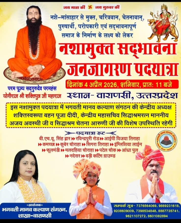 वाराणसी में नशामुक्ति के लिए विशाल पदयात्रा: श्री शक्तिपुत्र जी महाराज का संदेश – नशा मुक्त हो भारत देश’ वाराणसी। भगवती मानव कल्याण संगठन, शाखा-वाराणसी (उ.प्र.) द्वारा 4 अप्रैल 2026, शनिवार को एक विशाल नशामुक्त सद्भावना जनजागरण पदयात्रा का आयोजन किया जा रहा है। इस पदयात्रा का उद्देश्य वाराणसी को नशामुक्त बनाना और समाज में नशे के खिलाफ जागरूकता फैलाना है। पदयात्रा का नेतृत्व श्री शक्तिपुत्र जी महाराज करेंगे, जिनका संदेश है – “नशा मुक्त हो भारत देश।” यह यात्रा प्रातः 11:00 बजे बी.एच.यू. सिंह द्वारा से प्रारंभ होकर रविन्द्रपुरी…