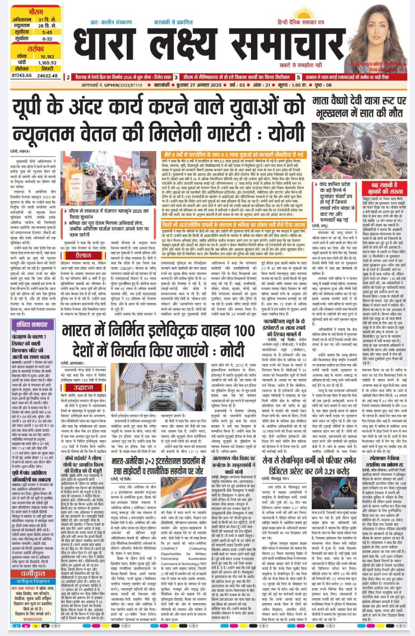 ई पेपर पढ़ें प्रातः कालीन संस्करण बाराबंकी से प्रकाशित हिन्दी दैनिक धारा लक्ष्य समाचार 27 अगस्त 2025 August 27, 2025 News Desk Post Views: 141
