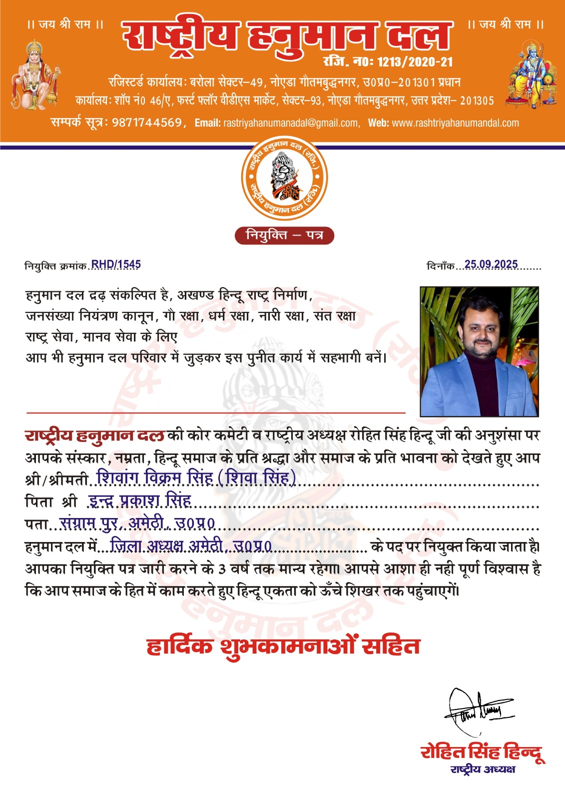 नियुक्ति पत्र में उल्लेख किया गया है कि हनुमान दल का संकल्प अखंड हिन्दू राष्ट्र निर्माण, जनसंख्या नियंत्रण कानून, गौ रक्षा, धर्म रक्षा, नारी रक्षा, संत रक्षा, राष्ट्र सेवा एवं मानव सेवा के लिए समर्पित है। इन दायित्वों को ध्यान में रखते हुए शिवांग विक्रम सिंह को यह जिम्मेदारी सौंपी गई है।
