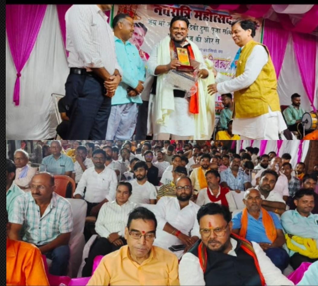 शारदीय नवरात्र पर्व के अवसर पर कस्बा स्थित मां जसवंतरी देवी मंदिर परिसर में दुर्गा पूजा महोत्सव में चेयरमैन प्रतिनिधि प्रभात साहू ने मुख्य अतिथि को अंग वस्त्र व प्रतीक चिन्ह देखकर किया सम्मानित
