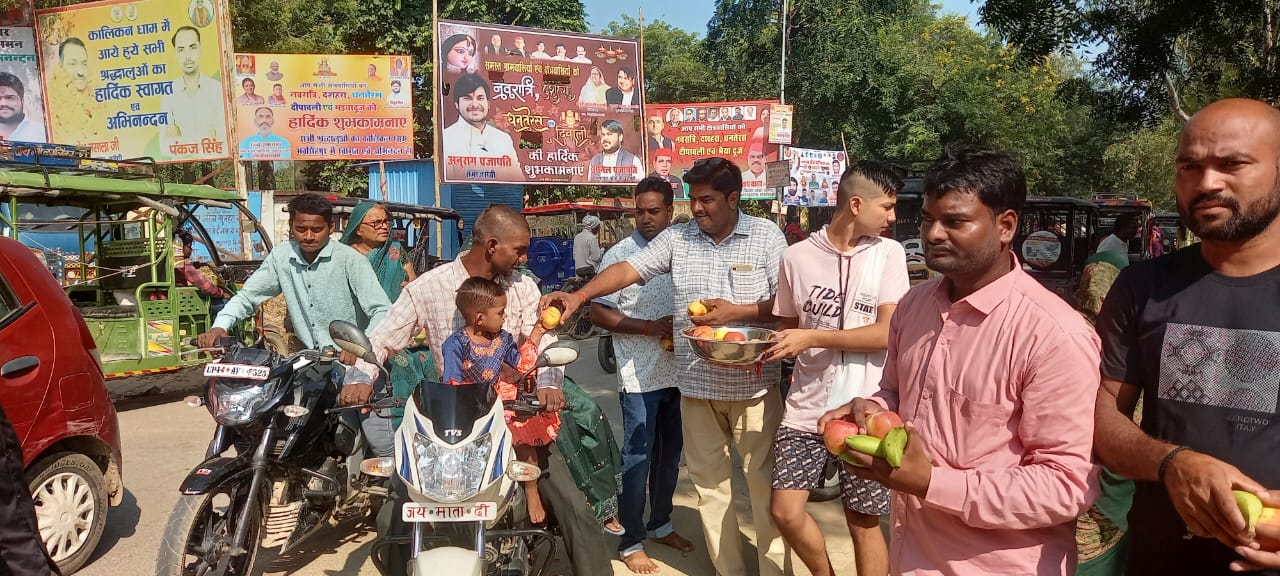 संग्रामपुर/अमेठी। सोमवार को शारदीय नवरात्रि के आठवें दिन माता कालिकन धाम में मुख्य गेट के पास सरैया कनू निवासी समाजसेवी लालता प्रसाद सरोज ने अपने सहयोगियों के साथ दर्शन करके लौट रहे सैकड़ों श्रद्धालुओं को फल वितरित किया।