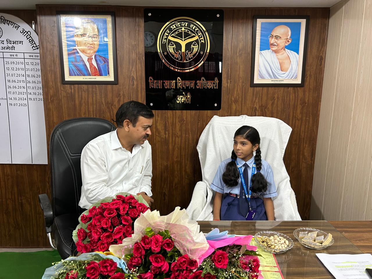 अमेठी। नारी सुरक्षा, सम्मान एवं स्वावलंबन के लिए समर्पित मिशन शक्ति 5.0 अभियान का शुभारंभ प्रदेश सरकार द्वारा शारदीय नवरात्रि के पावन अवसर पर किया गया है। इसके अंतर्गत जनपद अमेठी में जिलाधिकारी संजय चौहान एवं मुख्य विकास अधिकारी सूरज पटेल के निर्देशन में विविध कार्यक्रम आयोजित किए जा रहे हैं। इसी क्रम में शुक्रवार को चाणक्य इंटरनेशनल स्कूल, सैठा रोड गौरीगंज की कक्षा 6 की छात्रा कुमारी संध्या जायसवाल को एक दिन के लिए जिला खाद्य विपणन अधिकारी अमेठी बनाया गया।