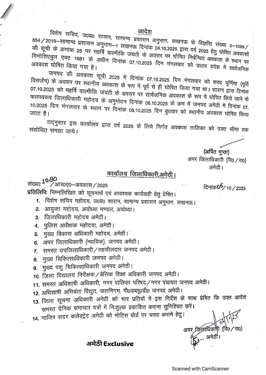 अमेठी। अपर जिलाधिकारी वित्त एवं राजस्व अर्पित गुप्ता ने बताया कि शासन द्वारा वर्ष 2025 हेतु घोषित अवकाशों की सूची में महर्षि वाल्मीकि जयंती के अवसर पर घोषित निर्बन्धित अवकाश के स्थान पर निगोशिएबल इन्स्ट्रूमेंट्स एक्ट, 1881 के अधीन दिनांक 07 अक्टूबर 2025 (मंगलवार) को सार्वजनिक अवकाश घोषित किया गया है।