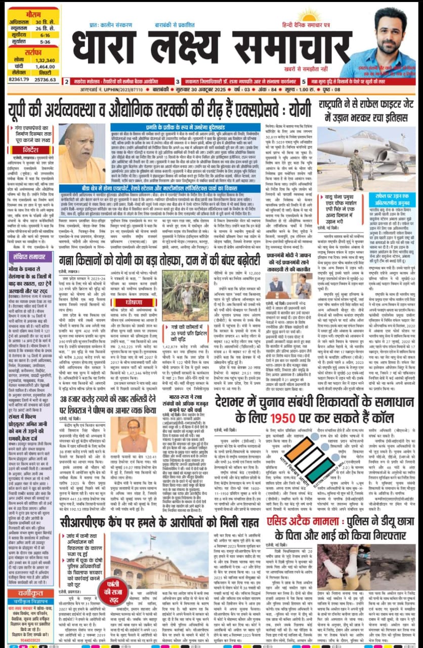 ई पेपर पढ़ें प्रातः कालीन संस्करण बाराबंकी से प्रकाशित हिंदी दैनिक धारा लक्ष्य समाचार पत्र 30 अक्तूबर 2025 November 3, 2025 News Desk Post Views: 41