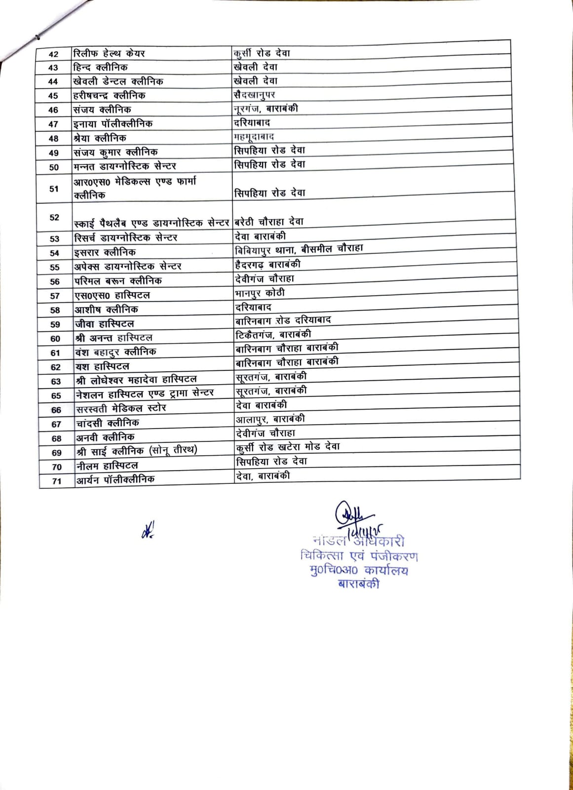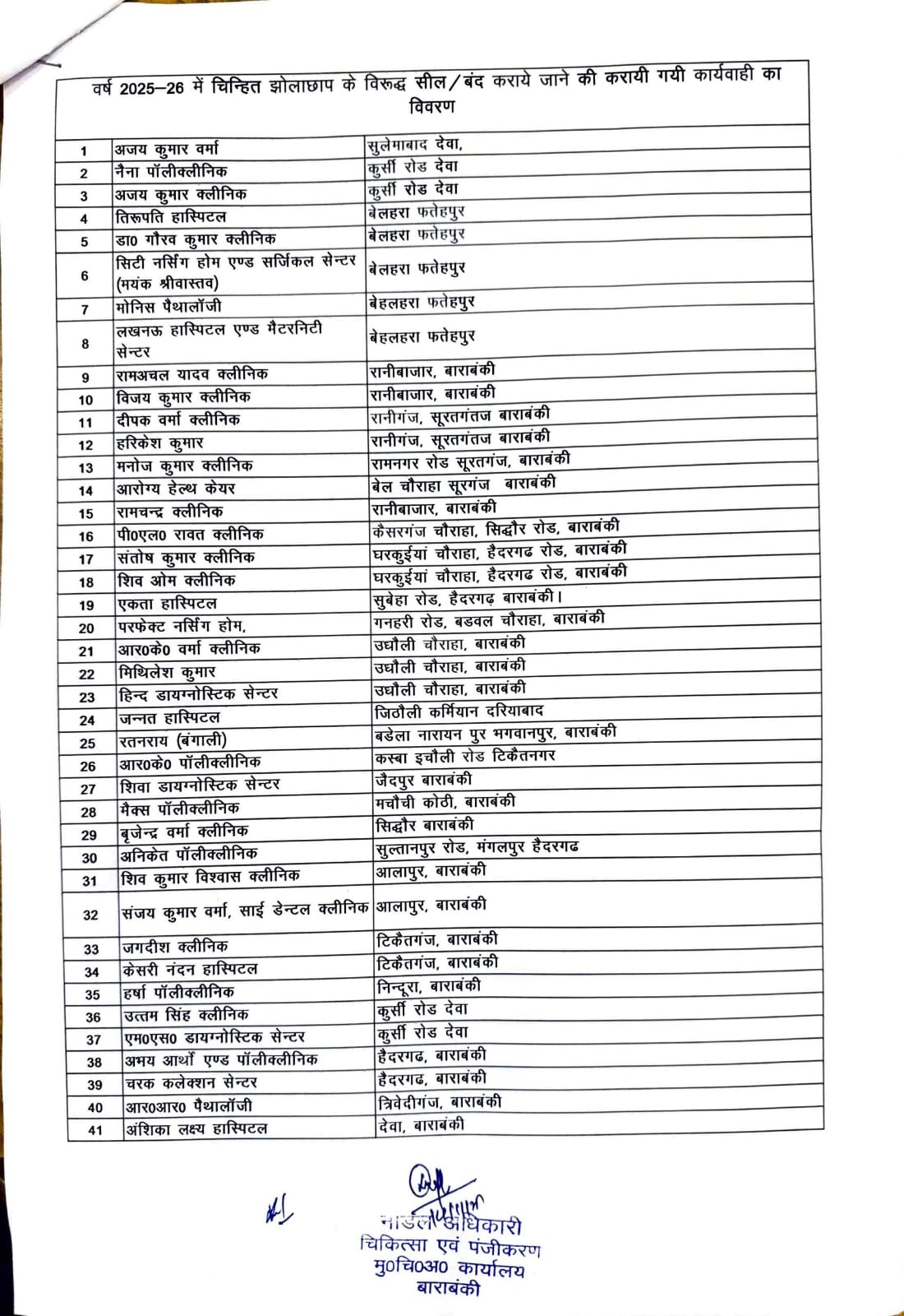 डीएम शशांक त्रिपाठी के निर्देश पर सीएमओ टीम ने अप्रैल से नवंबर तक ज़िलेभर में ताबड़तोड़ छापेमारी चलाते हुए देवा, फतेहपुर बेलहरा, रानीबाजार, सूरतगंज, हैदरगढ़, दरियाबाद, त्रिवेदीगंज, जैदपुर, सिद्धौर, टिकैतनगर, आलापुर, सुबेहा, इचौली रोड, निन्दूरा, महमूदाबाद, बिबियापुर, भानपुर कोठी सहित अन्य क्षेत्रों में संचालित 71 फर्जी अस्पताल, क्लीनिक और डायग्नोस्टिक सेंटर सील कर दिए।कार्रवाई की जद में अजय कुमार वर्मा,नैना पॉलीक्लीनिक,तिरूपति हास्पिटल,डा० गौरव कुमार क्लीनिक,सिटी नर्सिंग होम एण्ड सर्जिकल सेन्टर (मयंक श्रीवास्तव),मोनिस पैथालॉजी,लखनऊ हास्पिटल एण्ड मैटरनिटी सेन्टर,रामअचल यादव क्लीनिक,विजय कुमार क्लीनिक,दीपक वर्मा क्लीनिक,हरिकेश कुमार,मनोज कुमार क्लीनिक,आरोग्य हेल्थ केयर,रामचन्द्र क्लीनिक,पी०एल० रावत क्लीनिक,संतोष कुमार क्लीनिक,शिव ओम क्लीनिक,एकता हास्पिटल,परफेक्ट नर्सिंग होम,आर०के० वर्मा क्लीनिक,मिथिलेश कुमार,हिन्द डायग्नोस्टिक सेन्टर,जन्नत हास्पिटल,रतनराय (बंगाली),आर०के० पॉलीक्लीनिक,शिवा डायग्नोस्टिक सेन्टर,मैक्स पॉलीक्लीनिक,बृजेन्द्र वर्मा क्लीनिक,अनिकेत पॉलीक्लीनिक,शिव कुमार विश्वास क्लीनिक,संजय कुमार वर्मा,साई डेन्टल क्लीनिक,