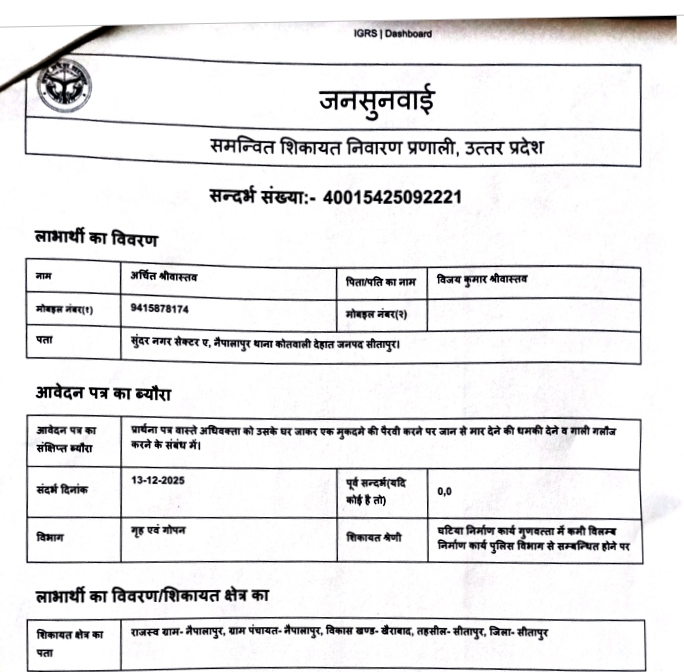 प्रार्थना-पत्र में बताया गया कि 12 दिसंबर 2025 की रात लगभग 9:10 बजे अभिषेक श्रीवास्तव उर्फ छोटू, अमन श्रीवास्तव उर्फ हर्षित तथा दो अज्ञात व्यक्ति उनके आवास पर पहुंचे और गाली-गलौज करते हुए मुकदमे की पैरवी न करने का दबाव बनाया। आरोपियों ने जान से मारने की धमकी भी दी।