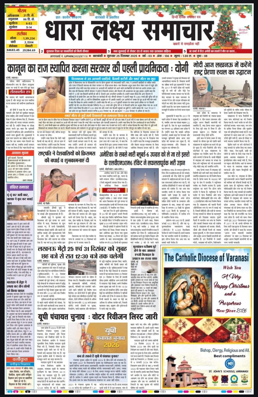 ई पेपर पढ़ें प्रातः कालीन संस्करण बाराबंकी से प्रकाशित हिंदी दैनिक धारा लक्ष्य समाचार पत्र 25 दिसंबर 2025 December 25, 2025 News Desk Post Views: 27