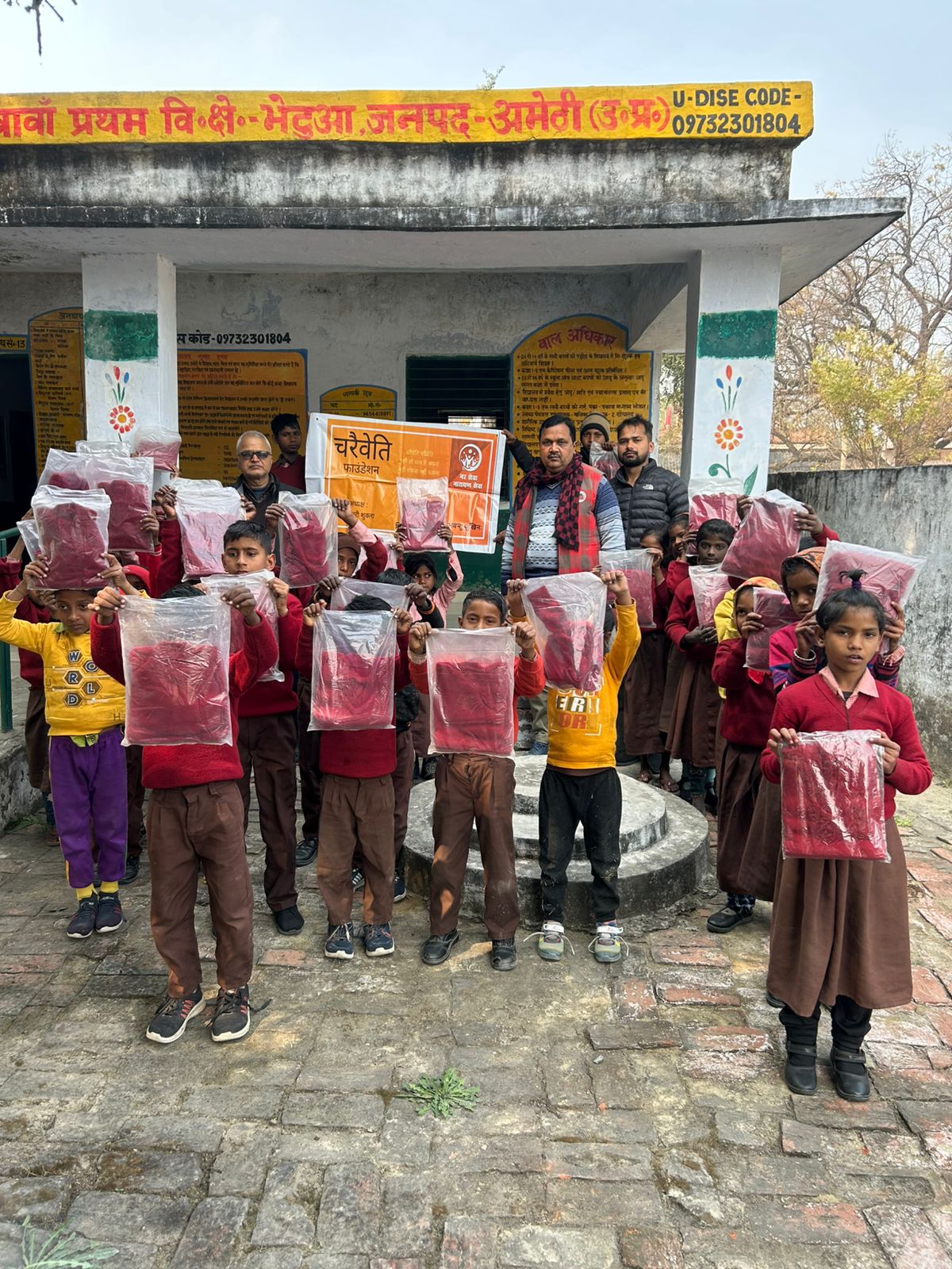 भेटुआ/अमेठी। ठंड से बचाव के लिए सामाजिक संगठन चरैवेति फाउण्डेशन के तत्वावधान में प्राथमिक विद्यालय सरुवावा प्रथम में बच्चों को गर्म वस्त्र वितरित किया गया।