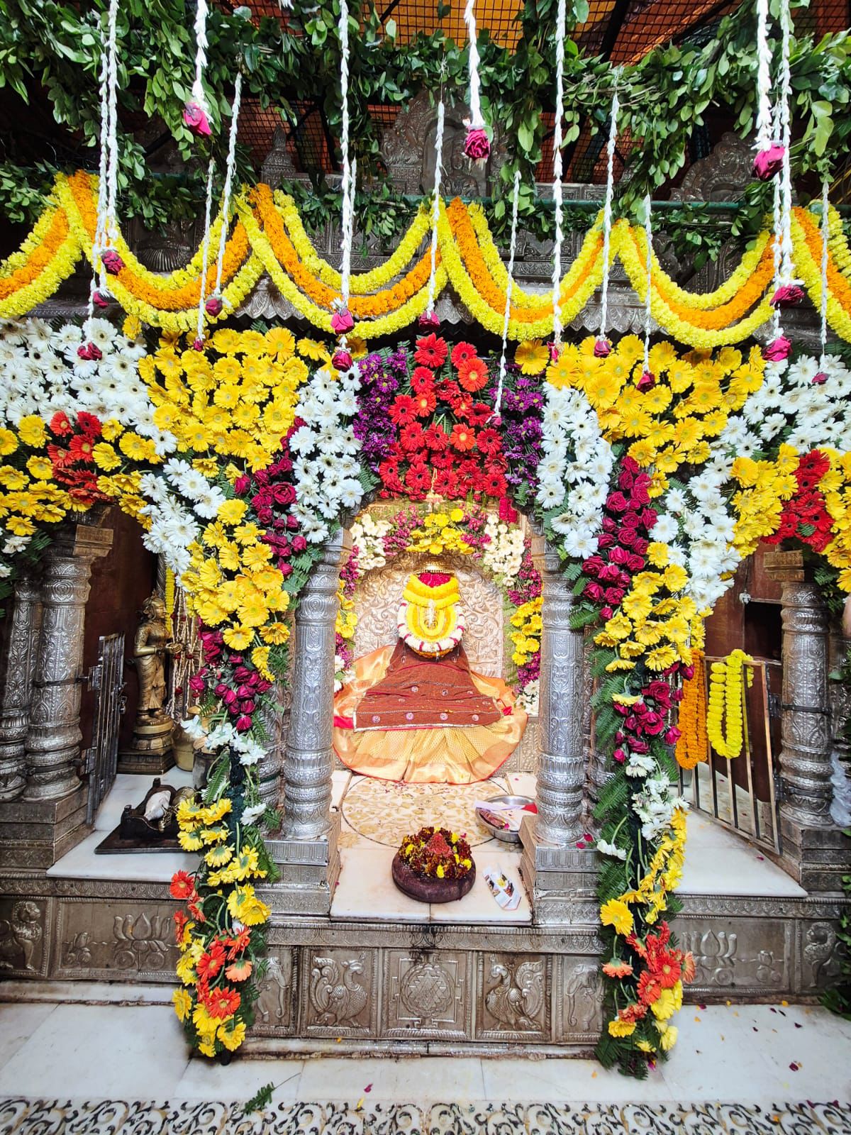 मंदिर परिषर कों विभिन्न प्रकार के फूलो से सजा।