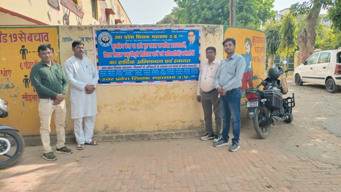 वाराणसी में शिक्षक महासभा का स्वागत अभियान, मूल्यांकन केंद्रों पर लगाया गया फ्लैक्स।
