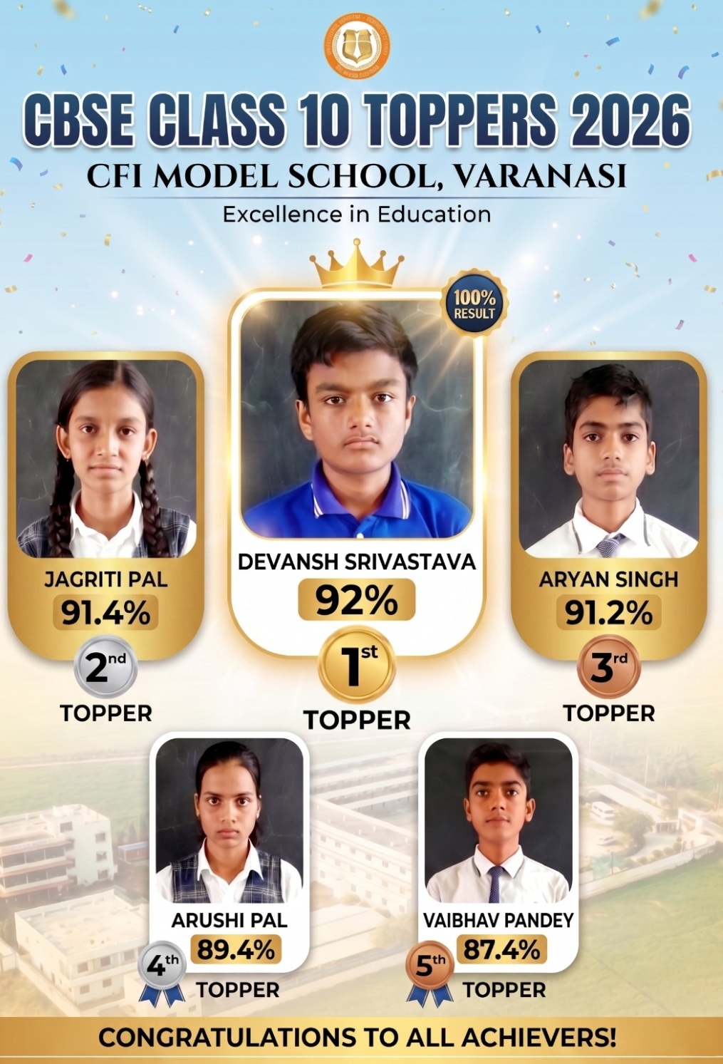 Pindra (Varanasi): CFI Model School, located in Deendaspur (Odar) under Pindra block, has once again demonstrated academic excellence by achieving a 100% pass result in the CBSE Class 10 examinations. Students from this rural-based institution showcased remarkable talent, bringing pride to the entire region.