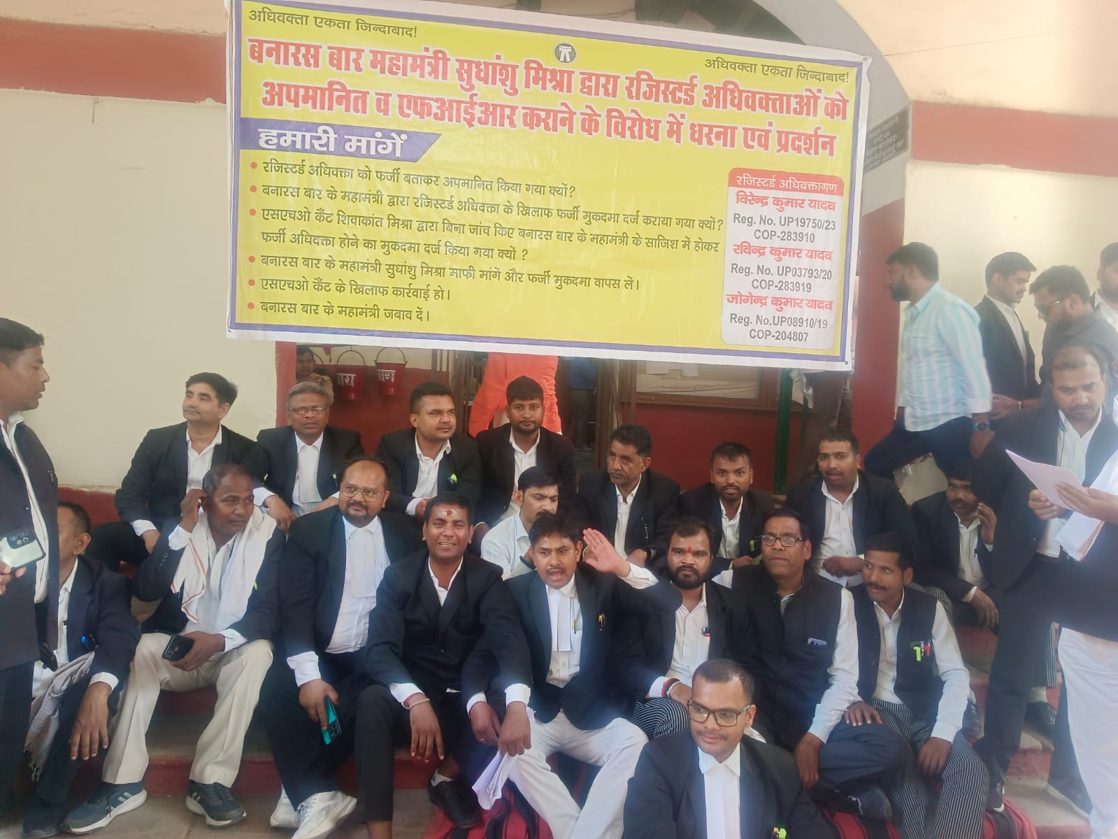 प्रदर्शनकारी अधिवक्ताओं ने सवाल उठाया कि एक रजिस्टर्ड अधिवक्ता को फर्जी बताकर सार्वजनिक रूप से अपमानित क्यों किया गया। साथ ही यह भी आरोप लगाया गया कि बनारस बार के महामंत्री द्वारा साजिशन रजिस्टर्ड अधिवक्ता के खिलाफ झूठा मुकदमा दर्ज कराया गया है।